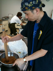 「 作ったんですよ。 」 と笑うオリジナルTシャツの胸のロゴが光ります。
